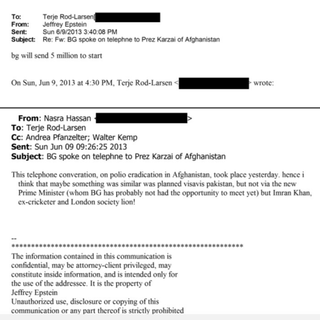9 Haziran 2013 tarihli başka bir yazışmada ise, Afganistan’ın eski Cumhurbaşkanı Hamid Karzai ile yapılan bir telefon görüşmesine açık şekilde atıf yapılıyor. “BG spoke on telephone to Prez Karzai of Afghanistan” başlığıyla iletilen e-postada, Afganistan’da polio eradikasyonu konusunda bir görüşmenin gerçekleştirildiği ifade ediliyor. Aynı mesajda, Pakistan için de benzer bir planın gündemde olabileceği, ancak bunun dönemin yeni başbakanı üzerinden değil, eski kriketçi ve siyasetçi Imran Khan üzerinden yürütülmüş olabileceği değerlendirmesi yer alıyor.