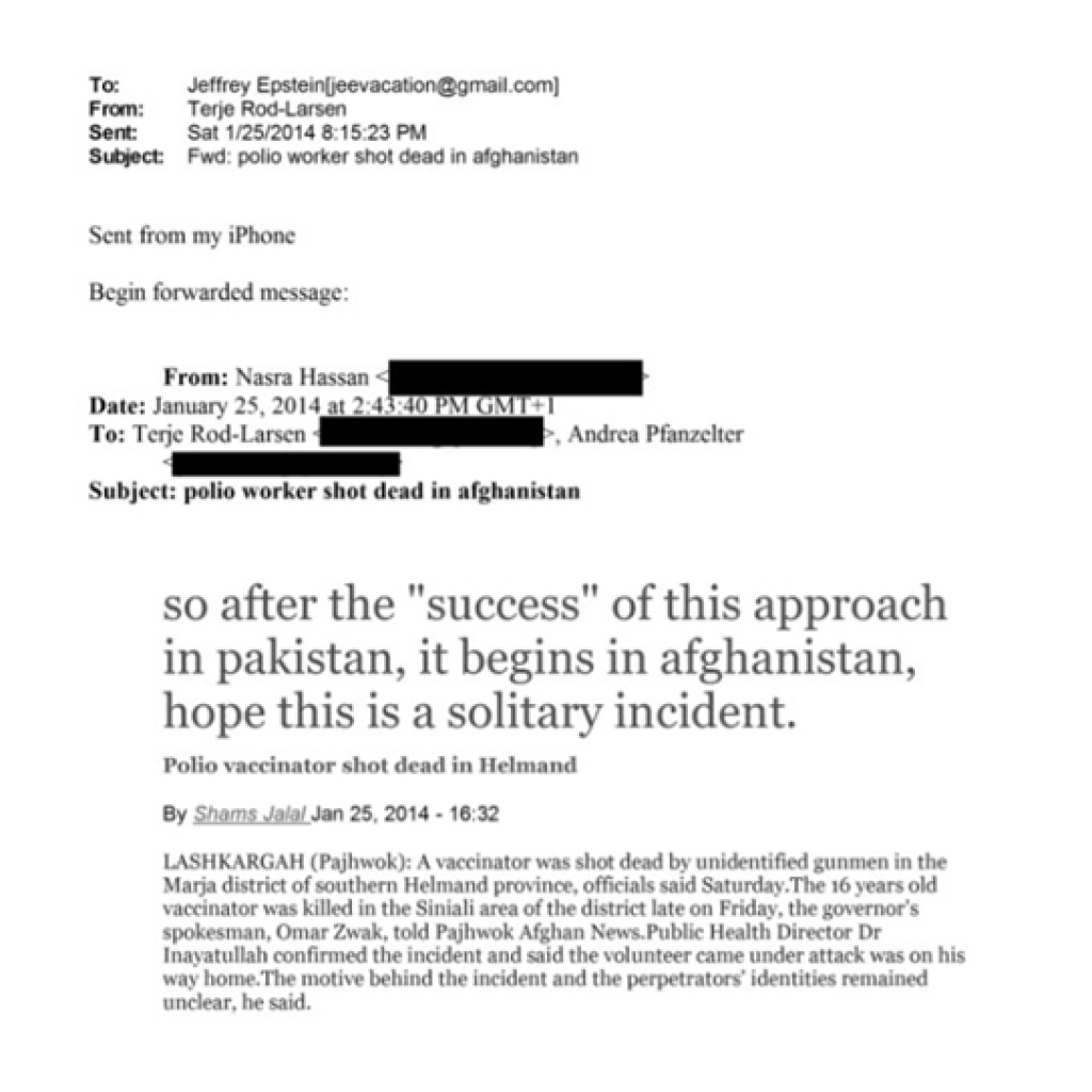 Yayınlanan belgelerde yer alan bir mailde 25 Ocak 2014 tarihli bir e-postada, Afganistan’ın Helmand vilayetinde bir polio aşı görevlisinin silahlı saldırı sonucu öldürülmesine ilişkin haberin Epstein’e iletildiği görülüyor. Mesajda, Pakistan’da uygulanan benzer bir yaklaşımın ardından Afganistan’da da aynı sürecin başladığı belirtilirken, saldırının münferit bir olay olarak kalması temennisine yer veriliyor.